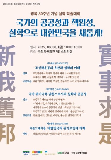 경기도는 오는 8월 8일, 국회의원회관 제1소회의실에서 ‘국가의 공공성과 책임성, 실학으로 대한민국을 새롭게!’를 주제로 학술대회를 연다. 이번 학술대회는 광복 80주년을 맞아 실사구시(實事求是), 즉 사실에 근거해 현실문제를 해결하는 태도에서 오늘날 사회문제를 돌아보고, 실학 정신을 새롭게 이어가기 위해 마련한 자리이다. 행사는 ‘경기도 실학 연구 및 진흥에 관한 조례’에 따라 추진 중인 ‘2025 신(新) 경세유표’ 사업의 일환으로 경기도가 주최하고, 경기문화재단 실학박물관(관장 김필국)과 다산연구소(이사장 김태희)가 주관한다.