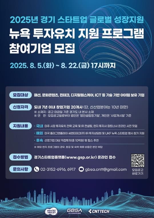 [경기경제신문] 경기도와 경기도경제과학진흥원은 도내 스타트업의 미국 시장 진출을 위해 ‘2025년 경기 스타트업 글로벌 성장지원 뉴욕 투자유치 지원 프로그램’에 참여할 기업을 오는 22일까지 모집한다.