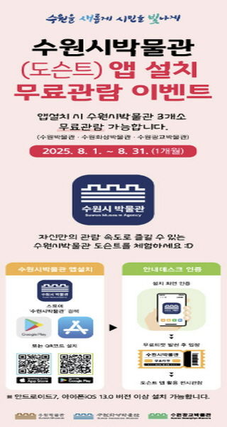 [경기경제신문] 수원시박물관은 8월 31일까지 ‘수원시박물관’ 앱을 설치하면 수원·수원화성·수원광교박물관 무료 관람로 관람할 수 있는 이벤트를 연다.