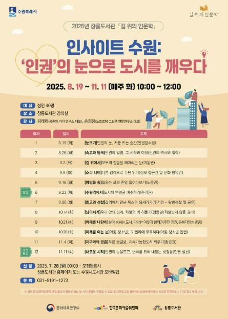 8월 19일부터 11월 11일까지 매주 화요일, 창룡도서관에서 총 12회 강의한다. 참가자는 책을 읽고, 강의를 듣고, 탐방을 하며 수원의 지역 현안을 인권의 시선으로 살펴본다.