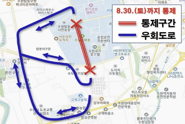 [경기경제신문] 수원시는 8월 30일까지 서둔동 수목원길 도로(서둔동 357-21번지 일원)를 정비한다. 도로 폭이 좁아 공사 장비를 이동할 때 차량 통행이 어려워 도로는 전면 통제된다. 정비 공사 구간 길이는 650m다.