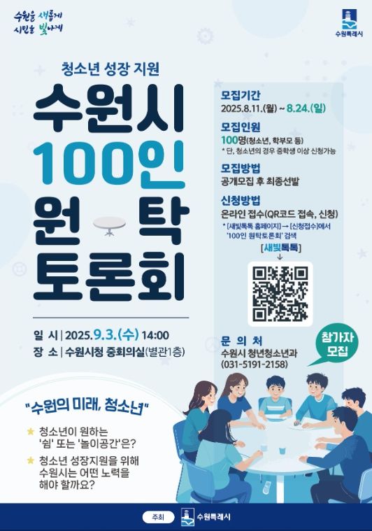 수원시 관계자는 “이번 원탁토론회는 청소년이 일상에서 원하는 쉼과 놀이 공간에 대해 목소리를 낼 수 있는 자리”라며 “청소년 눈높이에 맞는 정책 수립에 도움이 될 수 있도록, 많은 청소년이 참여하길 바란다”고 말했다.