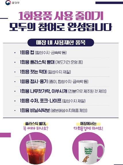 단, 1회용 종이컵은 규제대상에서 제외됐으며, 플라스틱 빨대의 경우 대체품 시장 상황을 반영해 계도기간을 연장 운영 중이다.