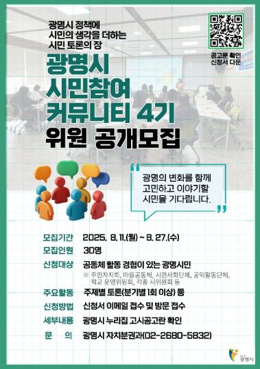 [경기경제신문] 광명시는 11일부터 27일까지 시민과 함께 정책 해법을 찾는‘시민참여 커뮤니티’ 4기 위원을 모집한다.