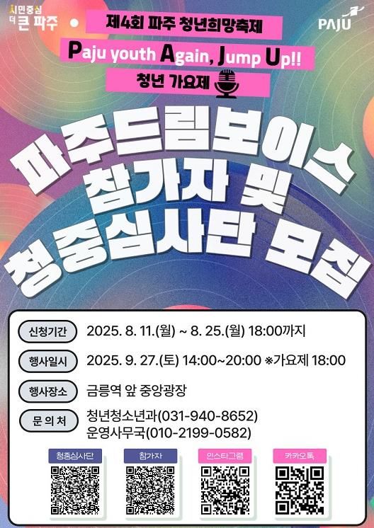[경기경제신문] 파주시는 오는 9월 27일 금릉역 앞 중앙광장에서 청년의 날을 기념해 개최되는 ‘제4회 파주 청년희망축제’의 대표 프로그램 중 하나인 청년가요제 ‘파주드림(Dream) 보이스’에 함께할 참가자와 청중심사단을 동시에 모집한다.