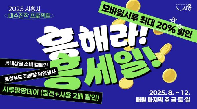 ‘흥해라 흥세일’은 8월부터 12월까지 매달 마지막 주 금ㆍ토ㆍ일요일에 ‘시루팡팡데이’와 ‘동네 상권 소비 캠페인’을 중심으로 진행된다. 총 16억 3천만 원의 예산을 투입해 지역화폐 사용 할인과 각종 소비 촉진 행사 등을 추진하며 실질적인 소비를 유도할 것으로 보인다.