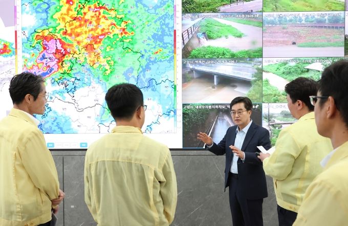 [경기경제신문] 경기도가 13일 오전 4시 30분부로 호우 대비 재난안전대책본부 비상 1단계를 발령한 가운데 김동연 경기도지사가 경기도 재난안전대책본부를 찾아 호우 피해상황을 살펴보고 대응체계를 점검했다.