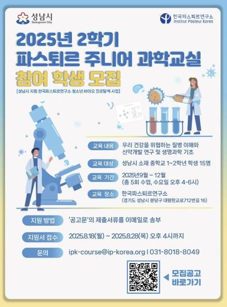 [경기경제신문] 성남시는 2025년 2학기 한국파스퇴르연구소 ‘주니어 과학교실’ 에 참여할 학생을 모집한다.