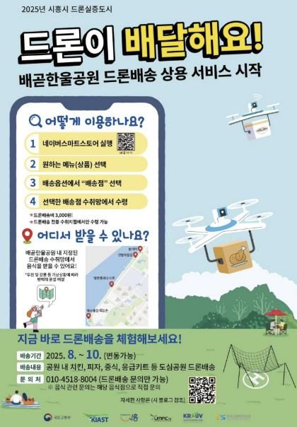 [경기경제신문] 시흥시가 국토교통부 ‘2025 드론 실증도시 구축사업’ 공모에 선정돼, 이달부터 10월 말까지 배곧한울공원 일대에서 드론을 활용한 배송 실증사업에 본격 착수한다. 이번 사업은 시흥시가 국비 5억 원을 확보해 추진하는 드론배송 상용화 사업으로, 공원을 찾는 시민들이 드론으로 배달되는 음식을 직접 받아볼 수 있는 체감형 서비스다.