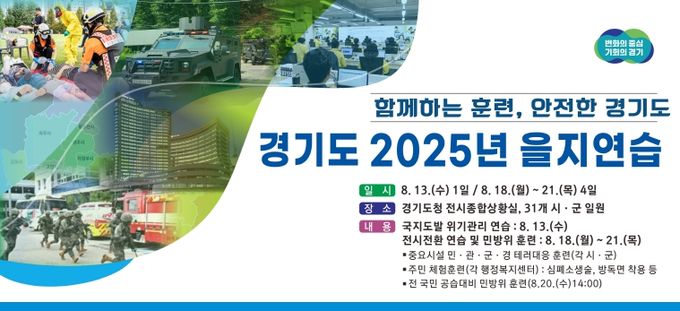 [경기경제신문] 경기도는 8월 18일부터 21일까지 4일간 각 시군, 군단급 부대, 경기북부·남부경찰청, 경기소방재난본부 등 유관기관과 연계해 지역 비상대비태세 확립을 위한 을지연습을 시행한다.