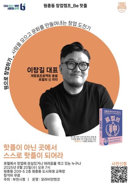 [경기경제신문] 부천시는 원종동 도시재생사업의 하나로 로컬 창업에 관심 있는 시민을 대상으로 한 공개교육 프로그램 ‘원종동 창업캠프: 비(BE) 핫플’을 8월 20일 오후 7시 원종동 도시재생 교육장(원종동 209-5, 2층)에서 개최한다.