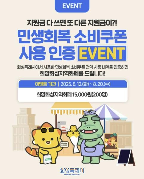 화성특례시에서 사용한 민생회복 소비쿠폰 전액 사용내역을 인증하면 추첨을 통해 총 200명에게 ‘희망화성지역화폐’ 1만 5천 원을 증정한다. 지급된 지역화폐는 관내 가맹점에서 자유롭게 사용할 수 있다.