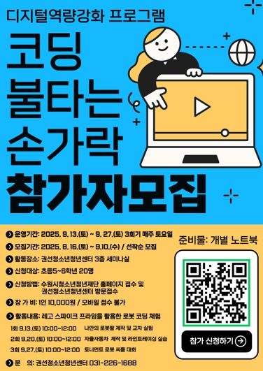 [경기경제신문] 수원시청소년청년재단 권선청소년청년센터에서 진행하는 청소년 코딩 교육 프로그램 ‘코딩 불타는 손가락’이 오는 9월 13일부터 27일까지 매주 토요일 총 3회에 걸쳐 진행된다.