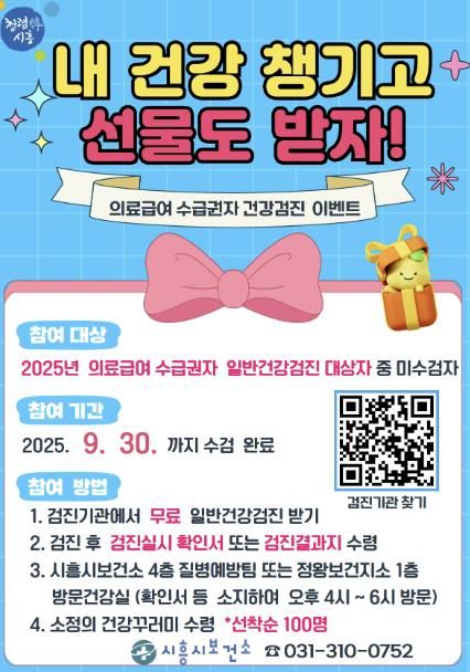 이형정 시흥시보건소장은 “일반건강검진은 건강을 지키는 가장 기본적인 수단”이라며 “이번 이벤트를 통해 많은 대상자가 검진에 참여해 건강한 일상을 누리기를 바란다”라고 전했다.