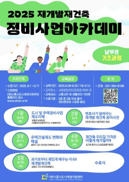 참여 대상은 재개발ㆍ재건축에 관심 있는 시흥시민과 생활권자이며, 선착순 100명을 모집한다. 강의는 무료로 제공되며, 강의 신청은 (재)시흥시도시재생지원센터 누리집에서 하면 된다.
