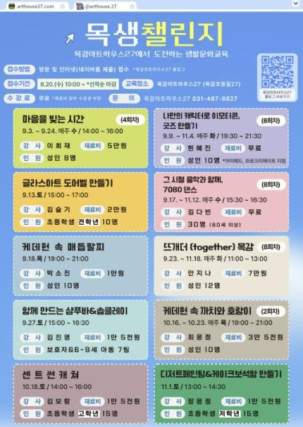 [경기경제신문] 시흥시는 목감아트하우스27에서 진행하는 2025년 하반기 생활문화교육 ‘목생챌린지’ 참여자를 모집한다.