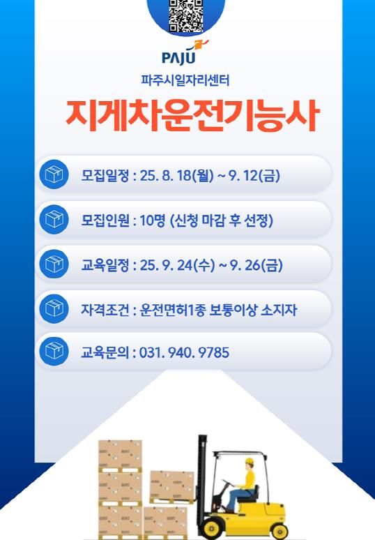 [경기경제신문] 파주시는 중장년층의 취업 역량 강화를 위해 하반기에도 ‘지게차(3톤 미만) 운전기능사 과정’ 교육생 10명을 모집한다. 모집 기간은 8월 18일부터 9월 12일까지이며, 교육비 전액이 무료로 지원된다.