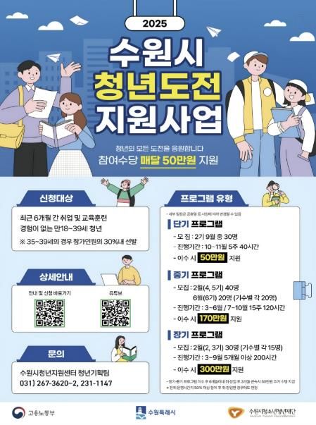 [경기경제신문] 수원시청소년청년재단 수원시청년지원센터는 9월 19일까지‘2025년 수원시 청년도전지원사업 단기 프로그램 2기’참여자를 모집한다고 밝혔다.