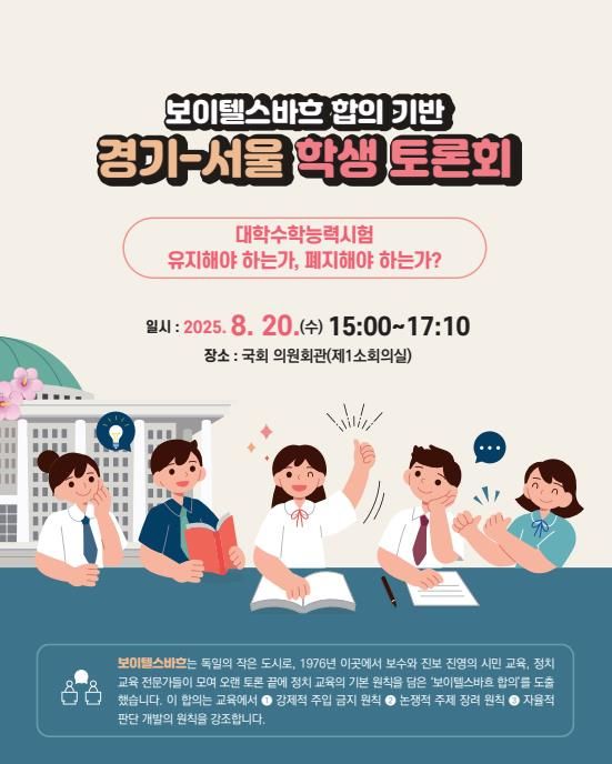 [경기경제신문] 경기도교육청이 20일 서울특별시교육청 국회 교육위원장 김영호 의원과 함께 ‘보이텔스바흐 합의 기반 경기-서울 학생 토론회’를 공동 개최한다. 학생들에게 보이텔스바흐 원칙을 바탕으로 교육을 포함한 정치·사회 분야에 적극적인 토론 기회를 제공하고자 마련한 자리다.