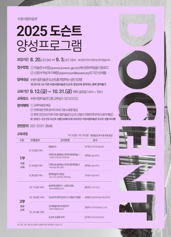 [경기경제신문] 경기도 수원시립미술관 미술관 도슨트(전시 해설사)를 희망하는 성인을 대상으로 '2025 SUMA 도슨트 양성 프로그램' 참여자를 8월 20일부터 모집한다.