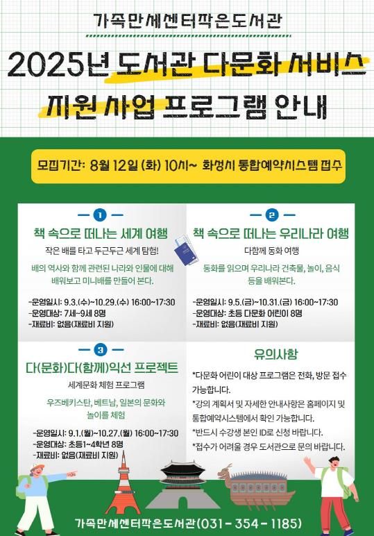 [경기경제신문] 화성시문화관광재단 가족만세센터작은도서관은 오는 9월부터 11월까지 ‘2025 도서관 다문화 서비스 지원사업’ 프로그램을 운영한다. 이번 사업은 문화체육관광부 주관 공모에 선정된 프로그램으로, 지역 어린이들의 다문화 수용성과 상호 문화 교류를 촉진하기 위해 기획됐다.