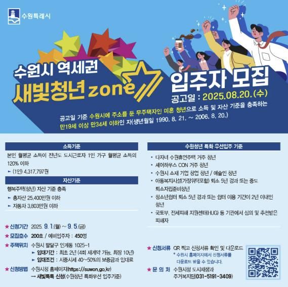 [경기경제신문] 수원시가 역세권 새빛 청년존(Zone) 3호 입주자를 9월 1일부터 5일까지 모집한다.