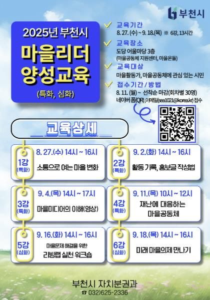 [경기경제신문] 부천시는 8월 27일부터 시작하는 ‘2025년 마을리더 양성교육(특화·심화과정)’ 수강생을 모집한다. 이번 교육은 마을활동에 관심 있는 시민을 마을리더로 양성하고, 활동가의 역량을 높이기 위해 마련됐다.
