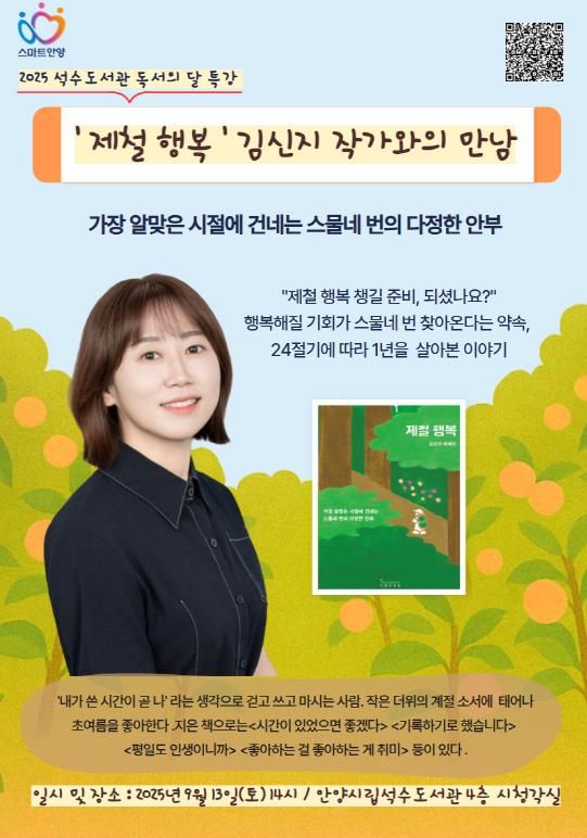 [경기경제신문] 안양시 석수도서관은 독서의 달을 맞아 오는 9월 13일 오후 2시, 4층 시청각실에서 베스트셀러 ‘제철 행복’의 저자 김신지 작가를 초청해 특별한 만남의 시간을 가진다.