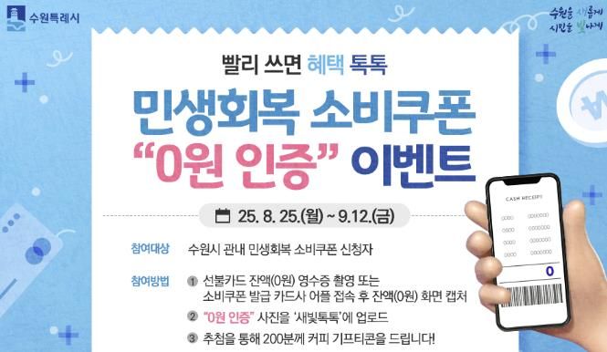 [경기경제신문] 수원시가 민생회복 소비쿠폰 사용을 독려하기 위해 8월 25일부터 9월 12일까지 ‘0원 인증 이벤트’를 연다.