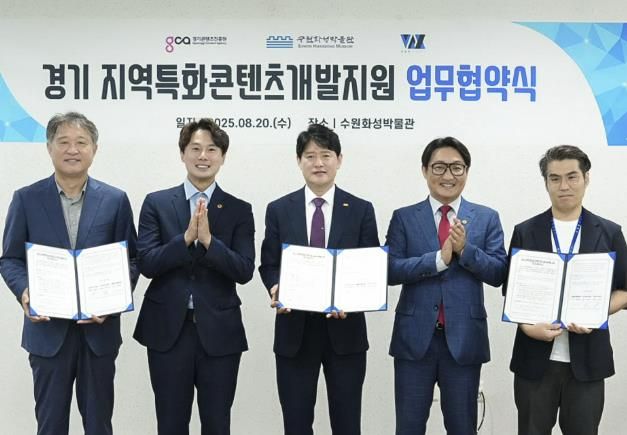 수원화성박물관과 경기콘텐츠진흥원, ㈜백스포트는 20일 수원화성박물관에서 협약을 체결하고, 경기 지역특화콘텐츠 개발지원 사업인 정조대왕 수원행차 영상 콘텐츠 제작을 위해 협력하기로 했다.