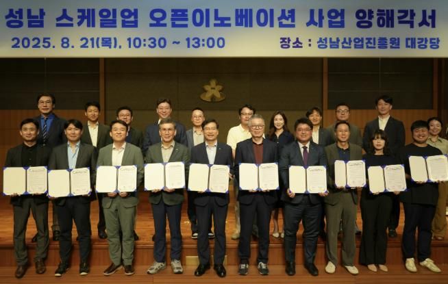 [경기경제신문] 성남산업진흥원은 8월 21일 킨스타워 7층 대강당에서 교보생명보험, DB손해보험, 세라젬, LG유플러스, 카카오모빌리티, KT, 한국에자이, 한화호텔앤드리조트, 호반건설 등 9개 대·중견기업과 ‘성남 스케일업 오픈이노베이션’ 양해각서(MOU)를 체결했다.
