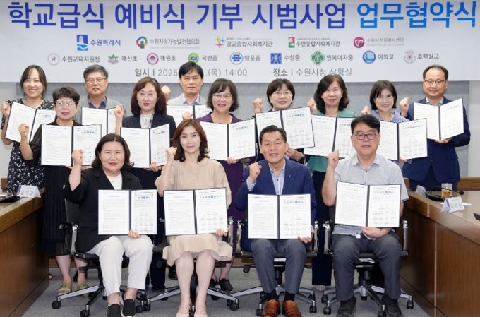 이날 협약식에는 이재준 수원시장, 수원교육지원청 하미진 교육국장, 예비식을 기부하는 8개 학교 교장·교감, 수원지속가능발전협의회 김찬수 운영위원장, 여지숙 광교종합사회복지관장, 황재경 우만종합사회복지관장, 수원시자원봉사센터 최영화 센터장 등이 참석했다.