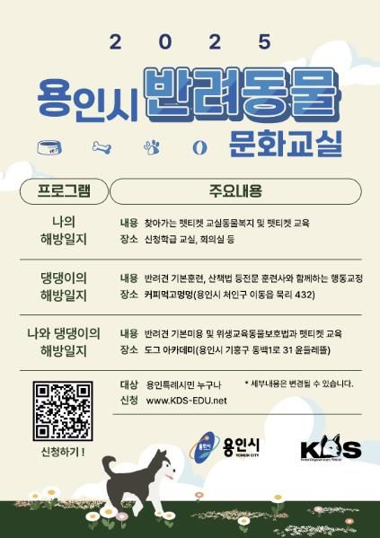 모든 수업은 오프라인으로 진행되며, 신청은 용인시 반려동물 문화교실 홈페이지 또는 홍보 포스터의 QR코드를 통해 가능하다.