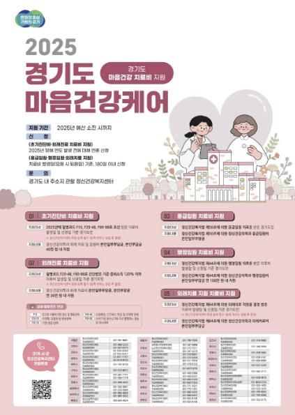 ▲마음건강케어(정신질환 초기진단비, 외래진료 치료비 지원 등), ▲청(소)년 마인드케어(만15세~34세 청(소)년, 외래치료비), ▲어르신마인드케어(65세 이상 어르신, 외래치료비) 등, 연령과 상황에 따라 지원받을 수 있다.