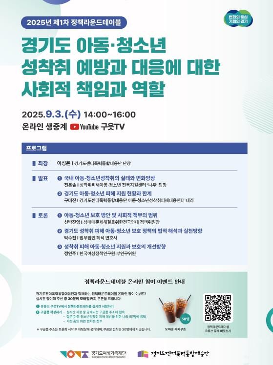 [경기경제신문] 경기도와 경기도여성가족재단 젠더폭력통합대응단은 오는 9월 3일 오후 2시, ‘경기도 아동·청소년 성착취 예방과 대응에 대한 사회적 책임과 역할’을 주제로 정책 라운드테이블을 개최한다.