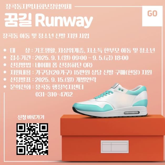 [경기경제신문] 시흥시 장곡동 행정복지센터는 장곡동 지역사회보장협의체와 저소득 아동과 청소년들이 밝고 건강하게 성장할 수 있도록 돕기 위한 맞춤형 신발 지원 사업 ‘꿈길 런웨이(Runway)’를 오는 9월 1일부터 추진한다.