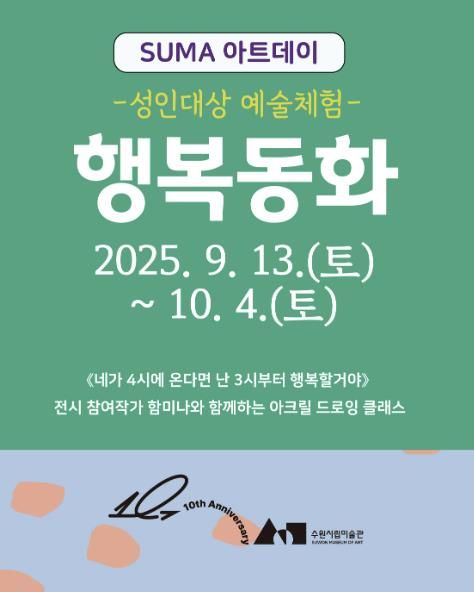 이번에 개최되는 'SUMA 아트데이: 행복동화'는 현재 수원시립미술관에서 개최 중인 현대미술기획전 《네가 4시에 온다면 난 3시부터 행복할 거야》와 연계해 운영된다. 전시 참여작가 함미나와 함께하는 이 프로그램은 성인 참여자들이 제공한 사진을 출력하여, 투명 아크릴 판에 선을 따라 그리고 다양한 색으로 채색하는 수업이다. 작가의 작업 의도를 직접 체험해 보고, 참여자들 간 뜻깊은 추억을 만들어 봄으로써 미술관에서 동화 같은 하루를 경험해 볼 수 있다.