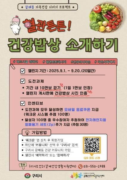 [경기경제신문] 구리시 갈매건강생활지원센터는 갈매동 주민들의 건강한 식습관 형성과 심뇌혈관질환 예방을 위해 ‘10만보 걷고, 혈관튼튼 건강밥상 소개하기’ 비대면 챌린지를 오는 9월 1일부터 20일까지 운영한다고 밝혔다.