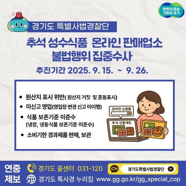 [경기경제신문] 경기도는 9월 15일부터 26일까지 추석 명절을 앞두고 성수식품 온라인 판매업소 360곳을 집중 수사한다고 밝혔다.