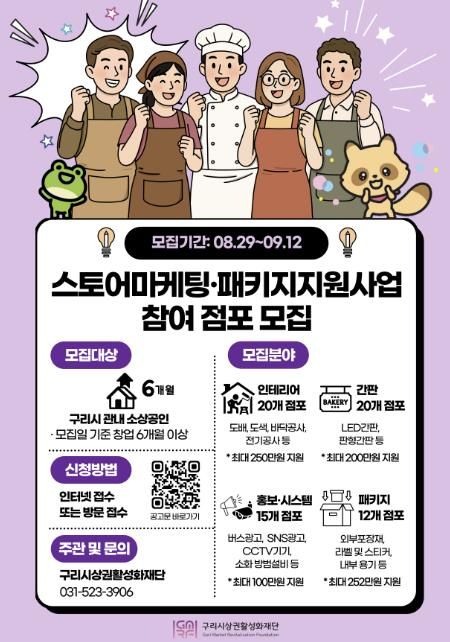 [경기경제신문] 구리시상권활성화재단은 구리시 소상공인의 경영 환경 개선과 마케팅 경쟁력 강화를 위해 8월 29일부터 9월 12일까지 ‘스토어마케팅·패키지 지원사업’ 참여 점포를 모집한다고 밝혔다.