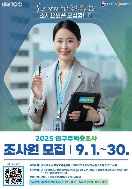 [경기경제신문] 통계청이 주관하고 전국 지자체가 5년 주기(끝자리 연도 0, 5)로 시행하는 '2025 인구주택총조사'의 통계조사원을 9월 1일 월요일부터 9월 30일 화요일까지 채용한다.