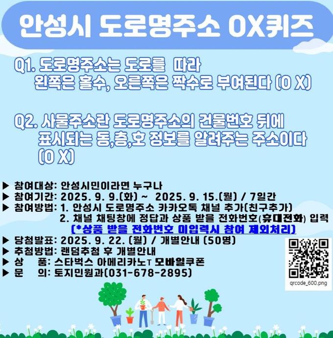 [경기경제신문] 안성시는 9월 9일부터 9월 15일까지 7일간 ‘도로명주소 OX퀴즈 이벤트’를 진행한다.
