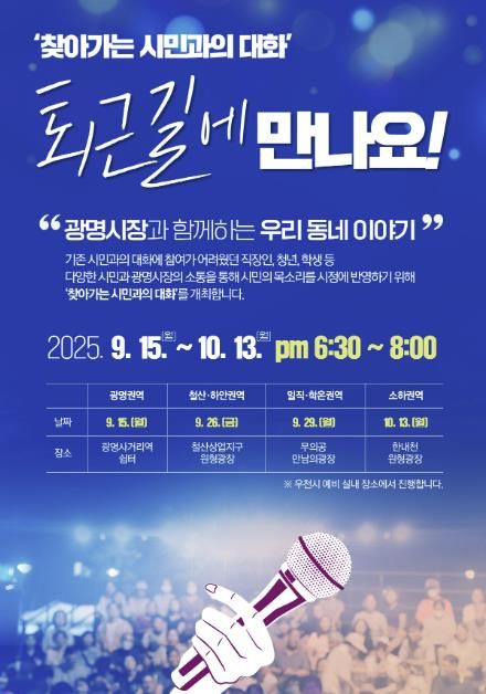 광명시는 오는 9월 15일부터 10월 13일까지 4회에 걸쳐 ‘2025년 찾아가는 시민과의 대화-퇴근길에 만나요!’를 개최한다고 4일 밝혔다.