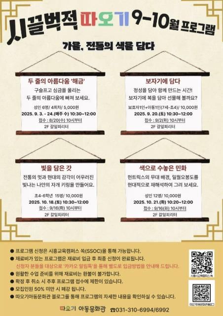 [경기경제신문] 시흥시 따오기아동문화관이 9월부터 10월까지 ‘전통’을 주제로 한 특별ㆍ상설프로그램을 운영한다. 이번 프로그램은 최근 흥행 중인 애니메이션 케이팝 데몬 헌터스의 인기로 높아진 전통문화 관심과 맞물려, 깊어 가는 가을에 아이들과 가족이 함께 우리 문화의 아름다움을 체험할 수 있도록 마련됐다.