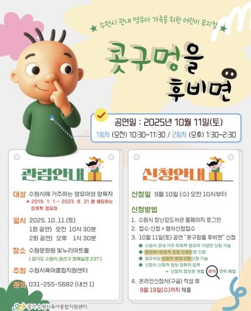 [경기경제신문] 수원시육아종합지원센터는 추석 연휴를 맞아 10월 11일 수원시 빛누리아트홀에서 어린이 뮤지컬 ‘콧구멍을 후비면’을 상연한다.