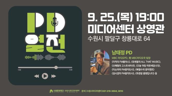 수원시미디어센터 관계자는 “남태정 PD는 한국 라디오 역사의 흐름 속에서 중심축 역할을 해온 PD로, 이번 강연은 평소 라디오를 즐겨 듣는 시민뿐만 아니라 라디오 기획 및 제작에 관심이 있는 시민들에게도 깊이 있는 배움의 기회를 제공할 것이다.”라며“더 나아가, 라디오와 음악, 사람을 잇는 창작의 가치를 직접 느낄 수 있는 특별한 시간이 될 것이다.”라고 전했다.