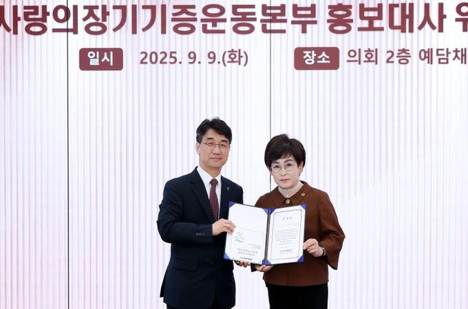 [경기경제신문] 경기도의회 교육기획위원회 소속 김선희 도의원(국민의힘, 용인7)이 9월 9일 ‘장기기증의 날’을 맞아 재단법인 사랑의 장기기증운동본부 홍보대사로 위촉됐다.