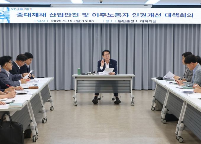 [경기경제신문] 정명근 화성특례시장은 15일 동탄출장소 대회의실에서 ‘중대재해 산업안전 및 이주노동자 인권개선 대책 회의’를 열고 안전하고 공정한 노동 환경 조성을 위한 방안을 논의했다.
