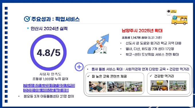 먼저 ‘픽업 서비스’는 마을공동체나 사회적경제조직 등 관계자가 ‘동행 보호자’로서 아이의 통학 차량에 함께 탑승해 하차와 돌봄센터 입실까지 전 과정을 책임지는 1:1 맞춤형 이동 서비스다. 전용 앱을 통해 자녀의 실시간 위치를 확인하는 것도 가능하다. 지난해 안산 돌봄기관 3개소에서 누적 1,003명의 아동이 이용했으며, 올해는 남양주 지역 7개소로 확대됐다.