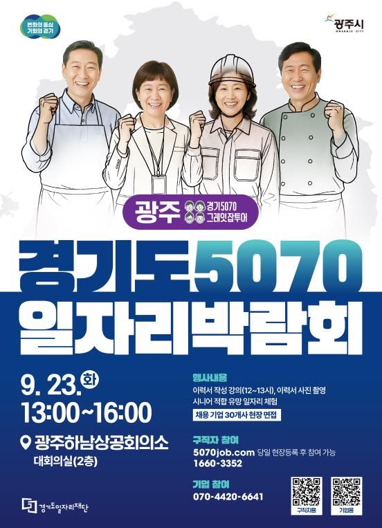 [경기경제신문] 경기도와 경기도일자리재단은 오는 23일 광주하남상공회의소에서 중장년층을 위한 ‘2025 경기도 5070 일자리박람회 in 광주’를 개최한다.